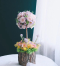 参与方式:电话咨询。活动时间以当日实际安排为准。 花与人们的生活密不可分。大众对花卉的喜爱程度渐长,显示了人类二十一世纪的生活趋向。插花艺术作为一种装饰时尚,不仅能美化室内环境,还能使我们享受到盎然的自然美。球形插花是花艺造型中相对来说比较有特点的 首先准备三条枝条,修剪同等长度,插入花泥中心位置,另一端捆绑成三角架形状,在准备两条短枝条,十字口对方,放上放上休整好造型的近似圆球※花泥固定在上端 在固定好花泥球后就可以逐步把块状花材插上,整个过程始终要保持块状花材在插入花泥球的深度 从而确保整个作品保持球型